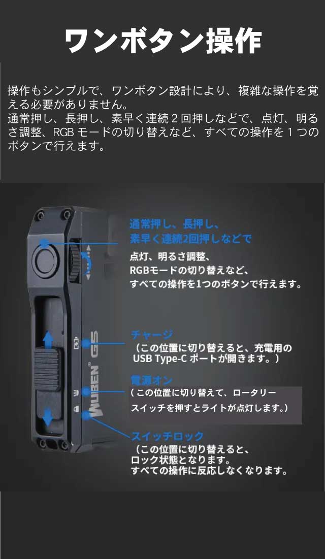 | モード | 白色光:400~2ルーメン(無段階調光)/50min~65h RGBモード:10ルーメン/9h ビーコン:10ルーメン/45h 点滅モード:10ルーメン/25h |