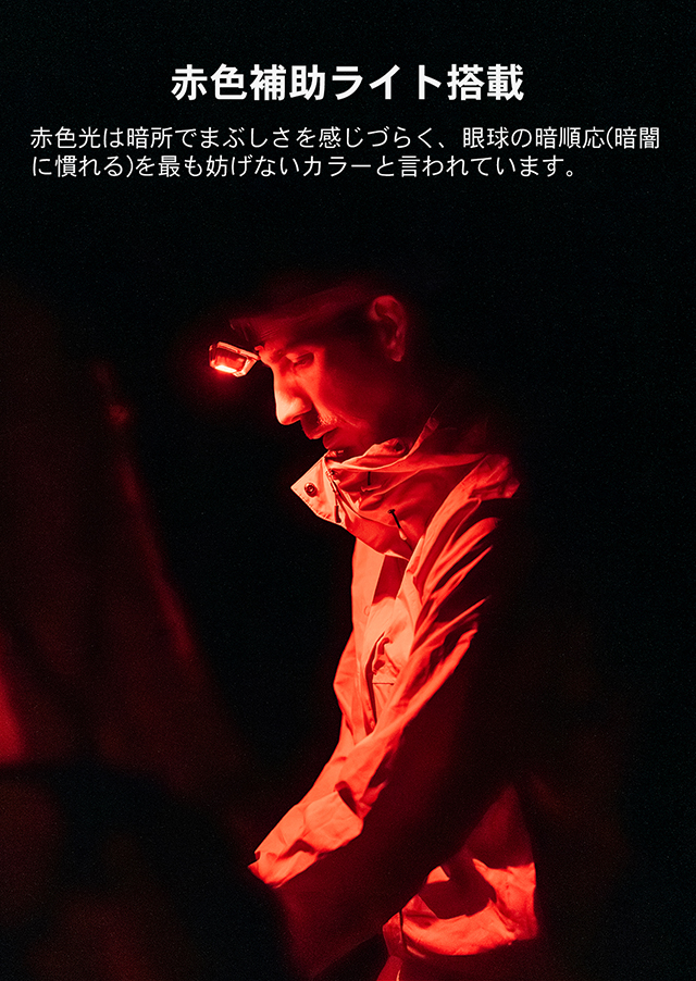 眼球の暗順応を最も妨げない赤色補助ライト搭載