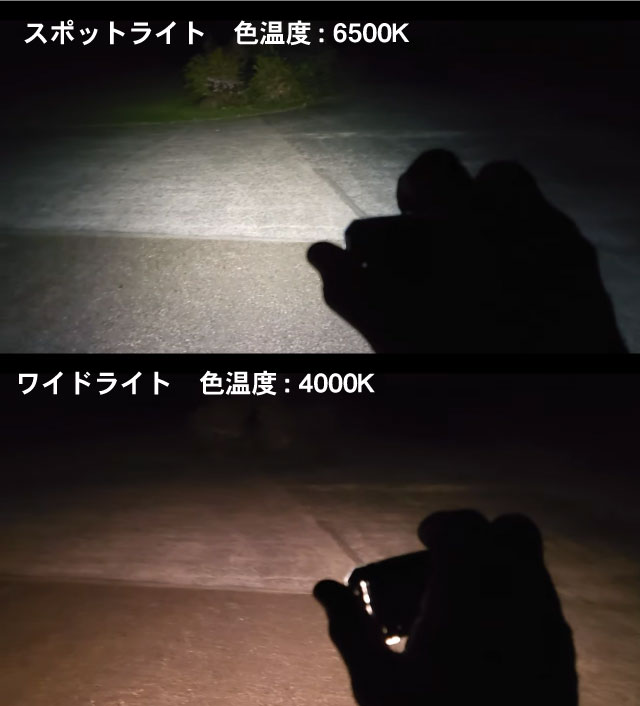 スポットライトの色温度は6500Kの昼光色、ワイドライトの色温度は4000Kの白色