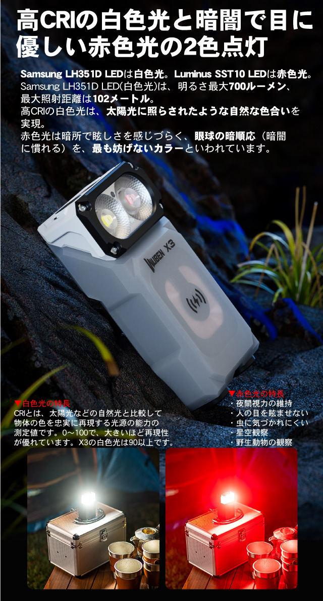 | LED | 白色光:Samsung LH351D&赤色光: Luminus SST10 | 使用電源 | 内蔵リチウムイオン充電池(1000mAh) |