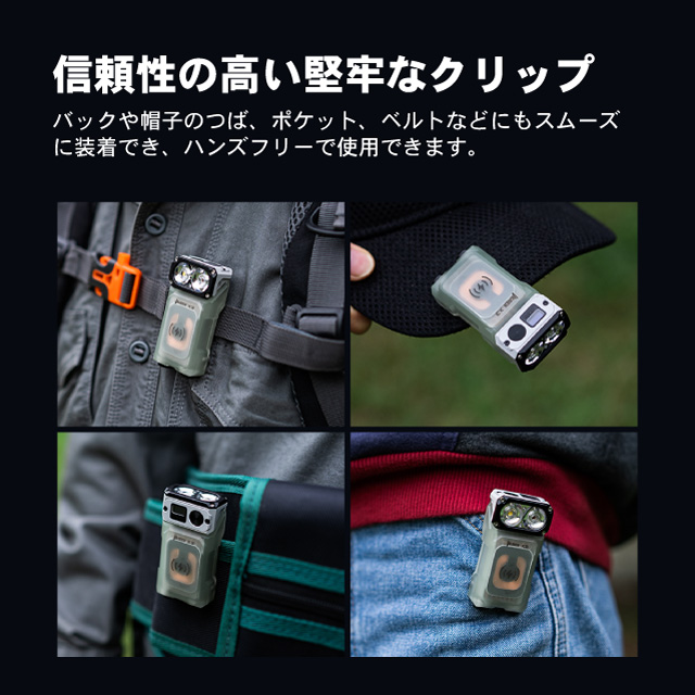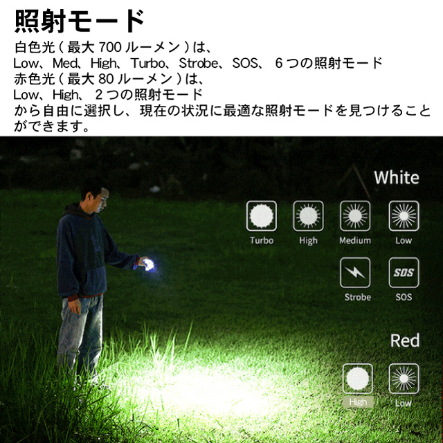 | モード | 白色光 Turboモード/700~200lm/30sec+1.5h Highモード/150lm/2h Medモード/50lm/6h Lowモード/1lm/50h Strobeモード/700lm SOSモード/150lm 赤色光 Highモード/80~30lm/30sec+2h Lowモード/1lm/30h |