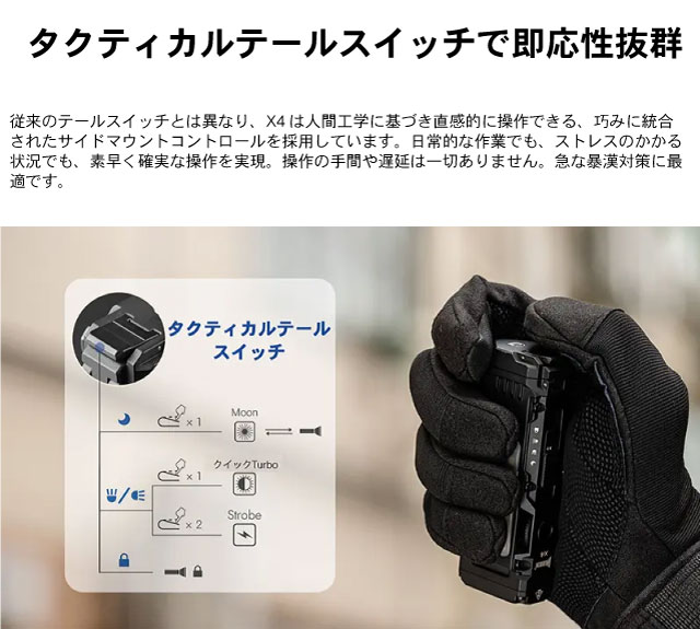 付属品 | ・X4 本体×1 ・18650-3350mAhリチウムイオン充電池)×1 ・Type-C充電ケーブル×1 ・ストラップ×1 ・取扱説明書×1 |