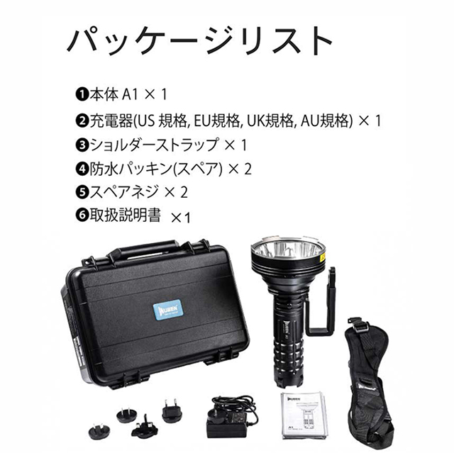 A1 本体 × 1 ショルダーストラップ × 1 充電器 × 1 防水パッキン(スペア) × 2 スペアネジ × 2 取扱説明書 × 1 |