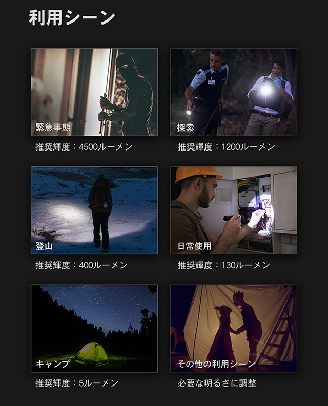 Turboモード/4500~1500lm/約1min+2.5h Highモード/2000~800lm/約3min+3h Med2モード/1200lm/約5h Med1モード/400lm/約8.5h Low2モード/130lm/約20h Low1モード/40lm/約45h Ecoモード/5lm/約110h ストロボモード/1200lm SOSモード/400lm |