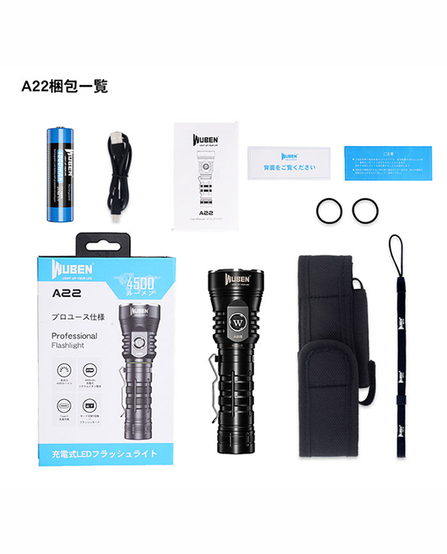 A22 本体 × 1 ABD4800(21700リチウムイオン充電池) × 1 ベルトポーチ × 1 ストラップ × 1 防水パッキン(スペア) × 2 Type-C充電ケーブル × 1 18650充電池アダプター × 1 取扱説明書 × 1 |