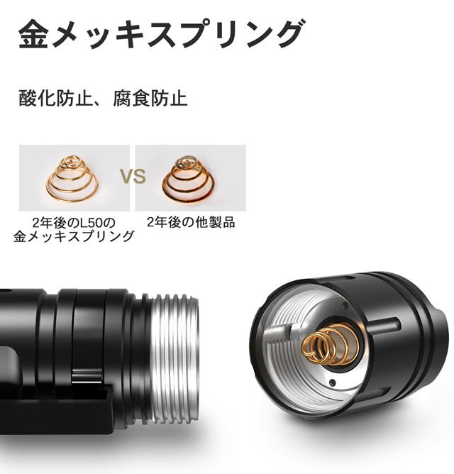 L50C 本体 × 1 ABE2600C(18650リチウムイオン充電池) × 1 ストラップ × 1 防水パッキン(スペア) × 2 Type-C充電ケーブル × 1 取扱説明書 × 1 |
